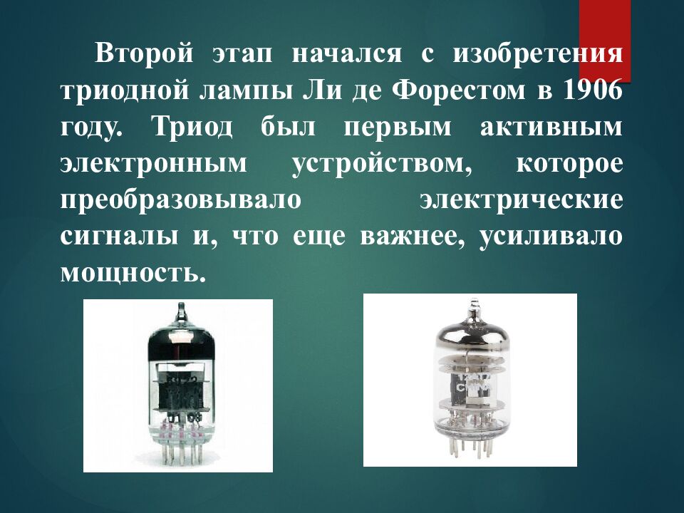 Второй этап начался с изобретения триодной лампы Ли де Форестом в 1906 году. Триод был первым активным электронным устройством, которое преобразовывало электрические сигналы и, что еще важнее, усиливало мощность.