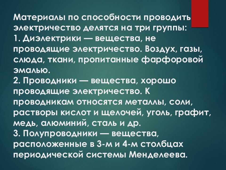 Слайд 14: Материалы по способности проводить электричество делятся на три группы: 1. Диэлектрики — вещества, не проводящие электричество. Воздух, газы, слюда, ткани, пропитанные фарфоровой эмалью. 2. Проводники — вещества, хорошо проводящие электричество. К проводникам относятся металлы, соли, растворы кислот и щелочей, уголь, графит, медь, алюминий, сталь и др. 3. Полупроводники — вещества, расположенные в 3-м и 4-м столбцах периодической системы Менделеева