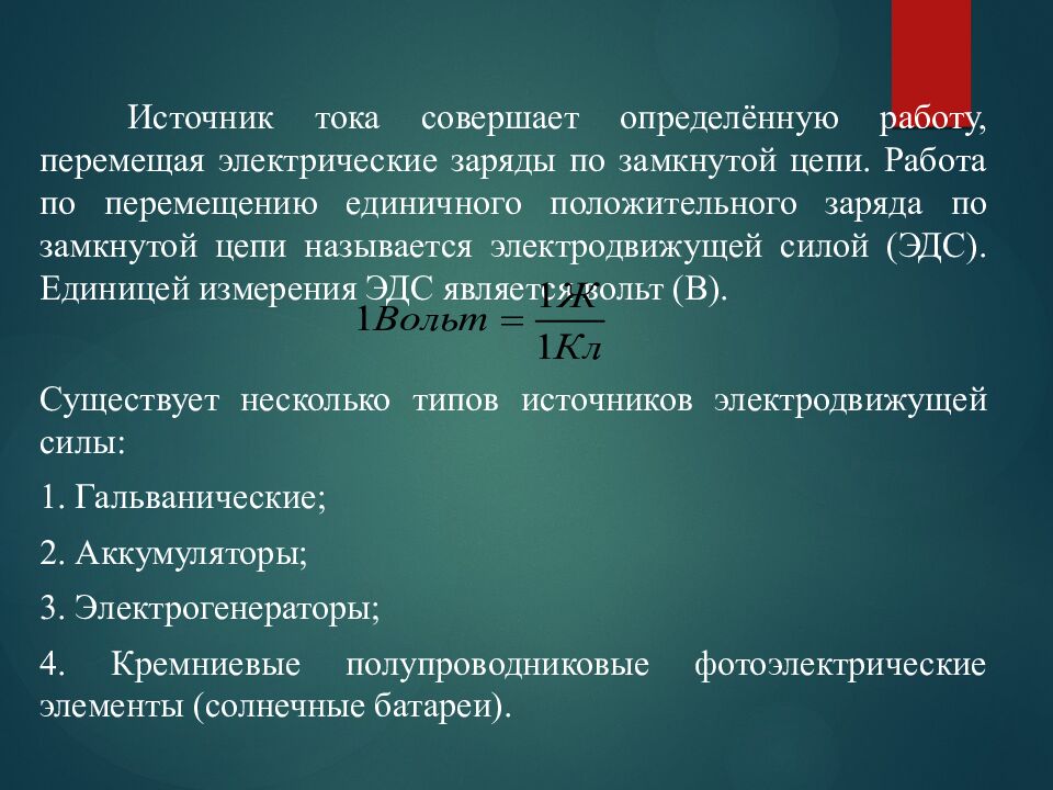 Источник тока совершает определённую работу, перемещая электрические заряды по замкнутой цепи. Работа по перемещению единичного положительного заряда по замкнутой цепи называется электродвижущей силой (ЭДС). Единицей измерения ЭДС является вольт (В). Существует несколько типов источников электродвижущей силы: 1. Гальванические; 2. Аккумуляторы; 3. Электрогенераторы; 4. Кремниевые полупроводниковые фотоэлектрические элементы (солнечные батареи).