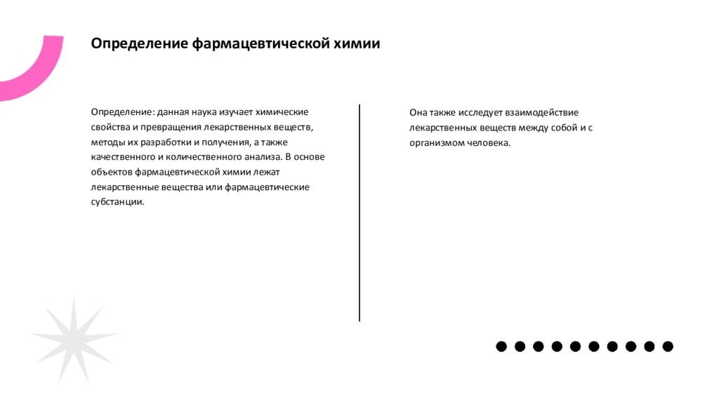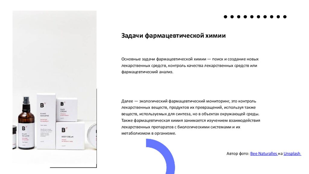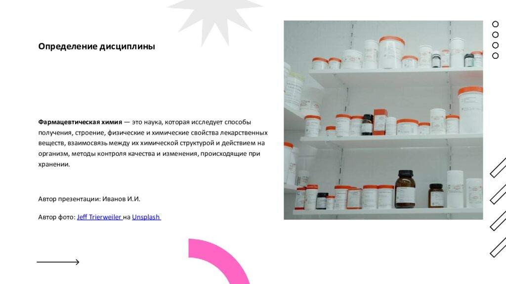 Автор фото: Jeff Trierweiler на Unsplash Автор презентации: Иванов И.И. Определение дисциплины Ф армацевтическая химия — это наука, которая и сследует способы получени я, строени е, физические и химические свойства лекарственных веществ, взаимосвязь между их химической структурой и действием на организм, методы контроля качества и изменения, происходящие при хранении.