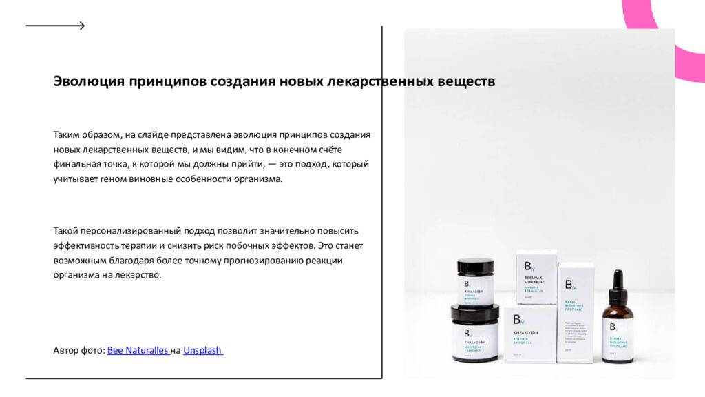 Автор фото: Bee Naturalles на Unsplash Эволюция принципов создания новых лекарственных веществ Таким образом, на слайде представлена эволюция принципов создания новых лекарственных веществ, и мы видим, что в конечном счёте финальная точка, к которой мы должны прийти, — это подход, который учитывает геном виновные особенности организма. Такой персонализированный подход позволит значительно повысить эффективность терапии и снизить риск побочных эффектов. Это станет возможным благодаря более точному прогнозированию реакции организма на лекарство.
