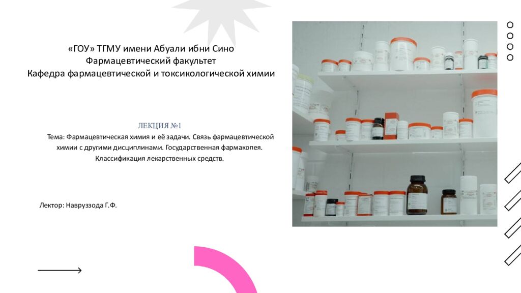 Лектор : Навруззода Г.Ф. «ГОУ» ТГМУ имени Абуали ибни Сино Фармацевтический факультет Кафедра фармацевтической и токсикологической химии Лекция №1 Тема : Фармацевтическая химия и её задачи. Связь фармацевтической химии с другими дисциплинами. Государственная фармакопея. Классификация лекарственных средств.