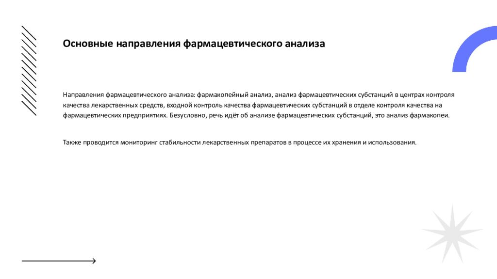 Основные направления фармацевтического анализа Направления фармацевтического анализа: фармакопейный анализ, анализ фармацевтических субстанций в центрах контроля качества лекарственных средств, входной контроль качества фармацевтических субстанций в отделе контроля качества на фармацевтических предприятиях. Безусловно, речь идёт об анализе фармацевтических субстанций, это анализ фармакопеи. Также проводится мониторинг стабильности лекарственных препаратов в процессе их хранения и использования.