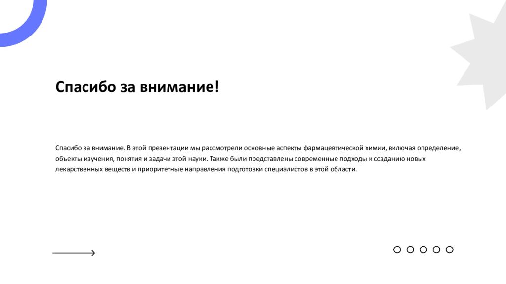 Спасибо за внимание! Спасибо за внимание. В этой презентации мы рассмотрели основные аспекты фармацевтической химии, включая определение, объекты изучения, понятия и задачи этой науки. Также были представлены современные подходы к созданию новых лекарственных веществ и приоритетные направления подготовки специалистов в этой области.