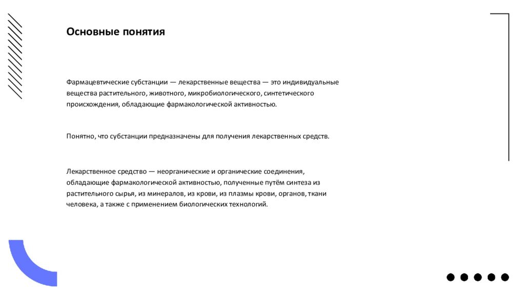 Основные понятия Фармацевтические субстанции — лекарственные вещества — это индивидуальные вещества растительного, животного, микробиологического, синтетического происхождения, обладающие фармакологической активностью. Понятно, что субстанции предназначены для получения лекарственных средств. Лекарственное средство — неорганические и органические соединения, обладающие фармакологической активностью, полученные путём синтеза из растительного сырья, из минералов, из крови, из плазмы крови, органов, ткани человека, а также с применением биологических технологий.