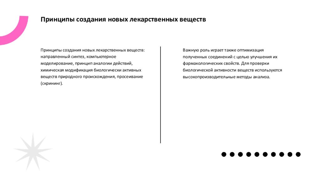 Принципы создания новых лекарственных веществ Принципы создания новых лекарственных веществ: направленный синтез, компьютерное моделирование, принцип аналогии действий, химическая модификация биологически активных веществ природного происхождения, просеивание (скрининг). Важную роль играет также оптимизация полученных соединений с целью улучшения их фармакологических свойств. Для проверки биологической активности веществ используются высокопроизводительные методы анализа.