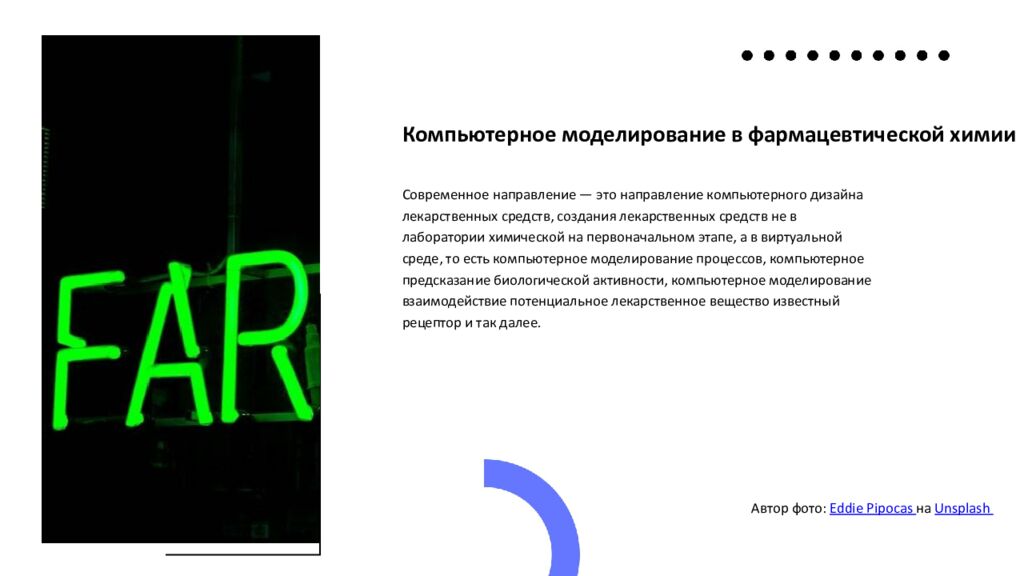 Автор фото: Eddie Pipocas на Unsplash Компьютерное моделирование в фармацевтической химии Современное направление — это направление компьютерного дизайна лекарственных средств, создания лекарственных средств не в лаборатории химической на первоначальном этапе, а в виртуальной среде, то есть компьютерное моделирование процессов, компьютерное предсказание биологической активности, компьютерное моделирование взаимодействие потенциальное лекарственное вещество известный рецептор и так далее.
