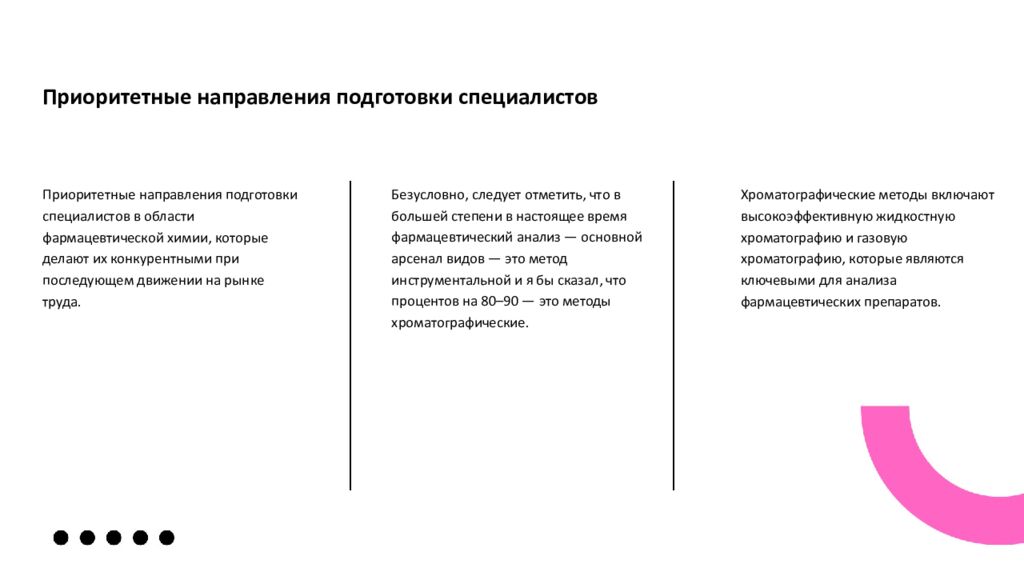 Приоритетные направления подготовки специалистов Приоритетные направления подготовки специалистов в области фармацевтической химии, которые делают их конкурентными при последующем движении на рынке труда. Безусловно, следует отметить, что в большей степени в настоящее время фармацевтический анализ — основной арсенал видов — это метод инструментальной и я бы сказал, что процентов на 80–90 — это методы хроматографические. Хроматографические методы включают высокоэффективную жидкостную хроматографию и газовую хроматографию, которые являются ключевыми для анализа фармацевтических препаратов.
