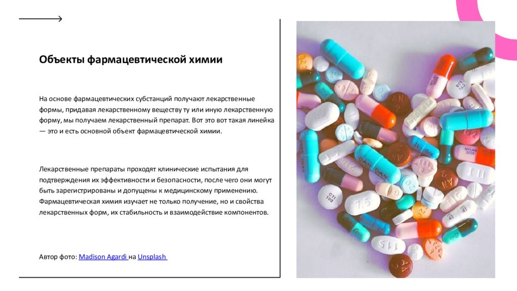 Автор фото: Madison Agardi на Unsplash Объекты фармацевтической химии На основе фармацевтических субстанций получают лекарственные формы, придавая лекарственному веществу ту или иную лекарственную форму, мы получаем лекарственный препарат. Вот это вот такая линейка — это и есть основной объект фармацевтической химии. Лекарственные препараты проходят клинические испытания для подтверждения их эффективности и безопасности, после чего они могут быть зарегистрированы и допущены к медицинскому применению. Фармацевтическая химия изучает не только получение, но и свойства лекарственных форм, их стабильность и взаимодействие компонентов.