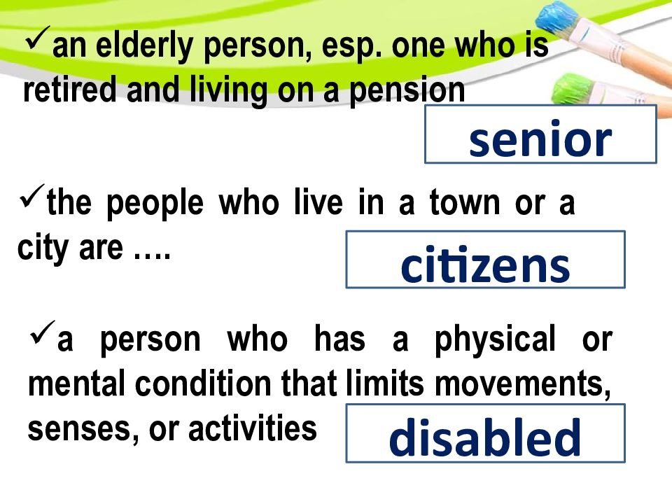 an elderly person, esp. one who is retired and living on a pension senior the people who live in a town or a city are …. citizens a person who has a physical or mental condition that limits movements, senses, or activities disabled