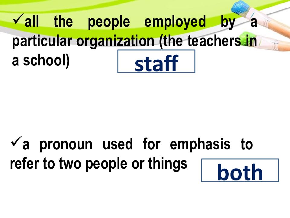 all the people employed by a particular organization (the teachers in a school) staff a pronoun used for emphasis to refer to two people or things both