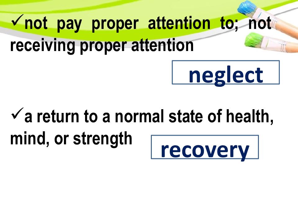 not pay proper attention to; not receiving proper attention neglect a return to a normal state of health, mind, or strength recovery