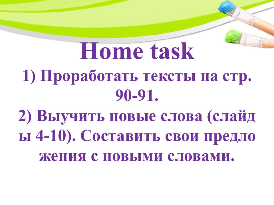 Слайд 15: Home task 1) Проработать тексты на стр. 90-91. 2) Выучить новые слова (слайды 4-10). Составить свои предложения с новыми словами
