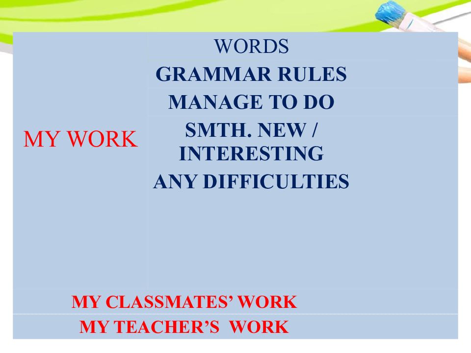MY WORK WORDS GRAMMAR RULES MANAGE TO DO SMTH. NEW / INTERESTING ANY DIFFICULTIES MY CLASSMATES’ WORK MY TEACHER’S WORK