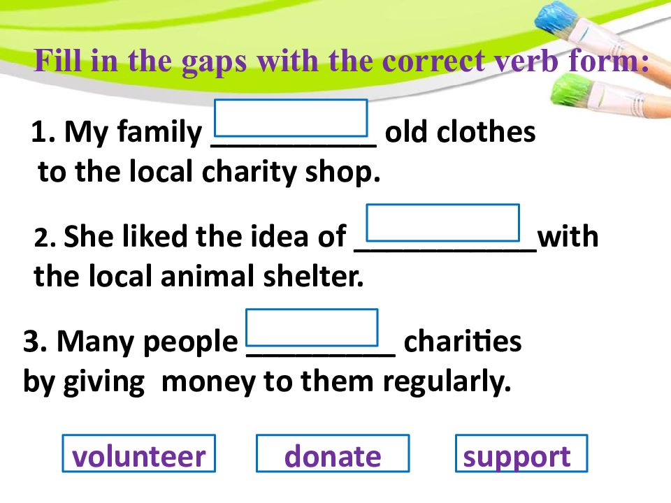 My family __________ old clothes to the local charity shop. 2. She liked the idea of ___________with the local animal shelter. 3. Many people _________ charities by giving money to them regularly. donate volunteer support