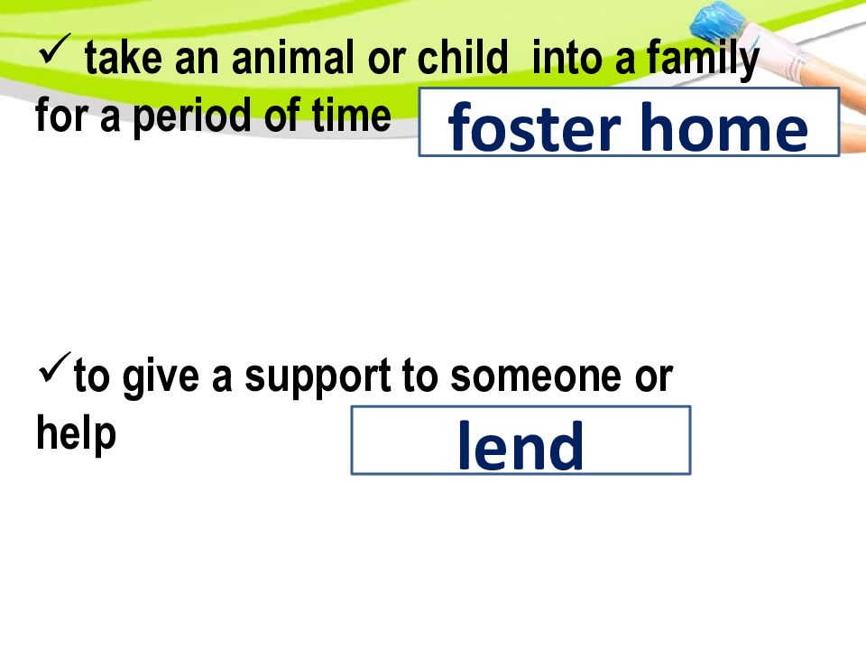 take an animal or child into a family for a period of time f oster home t o give a support to someone or help lend