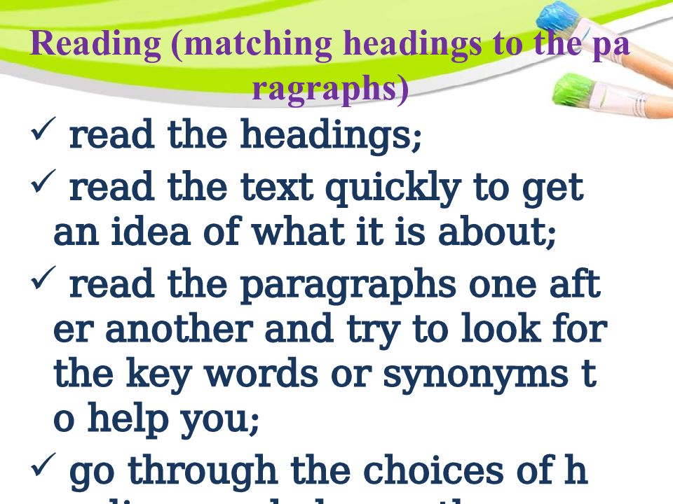read the headings; read the text quickly to get an idea of what it is about; read the paragraphs one after another and try to look for the key words or synonyms to help you; go through the choices of headings and choose the one.