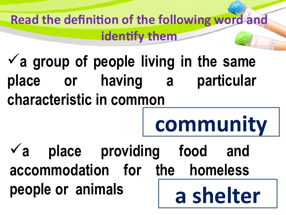 a group of people living in the same place or having a particular characteristic in common community a place providing food and accommodation for the homeless people or animals a shelter
