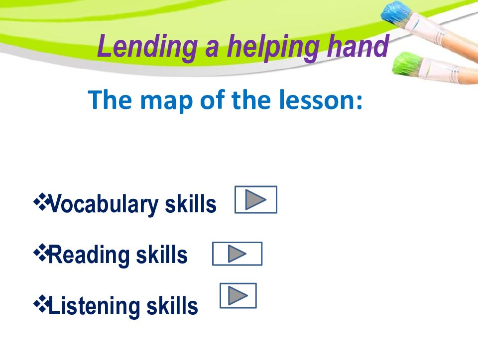 Vocabulary skills Reading skills Listening skills Lending a helping hand