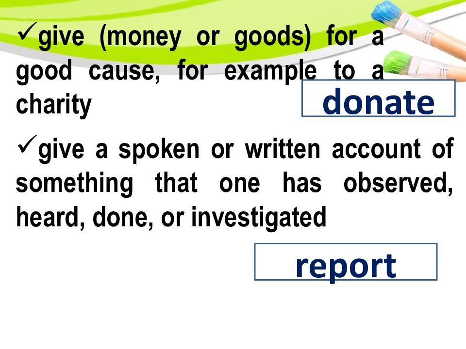 give (money or goods) for a good cause, for example to a charity donate give a spoken or written account of something that one has observed, heard, done, or investigated report