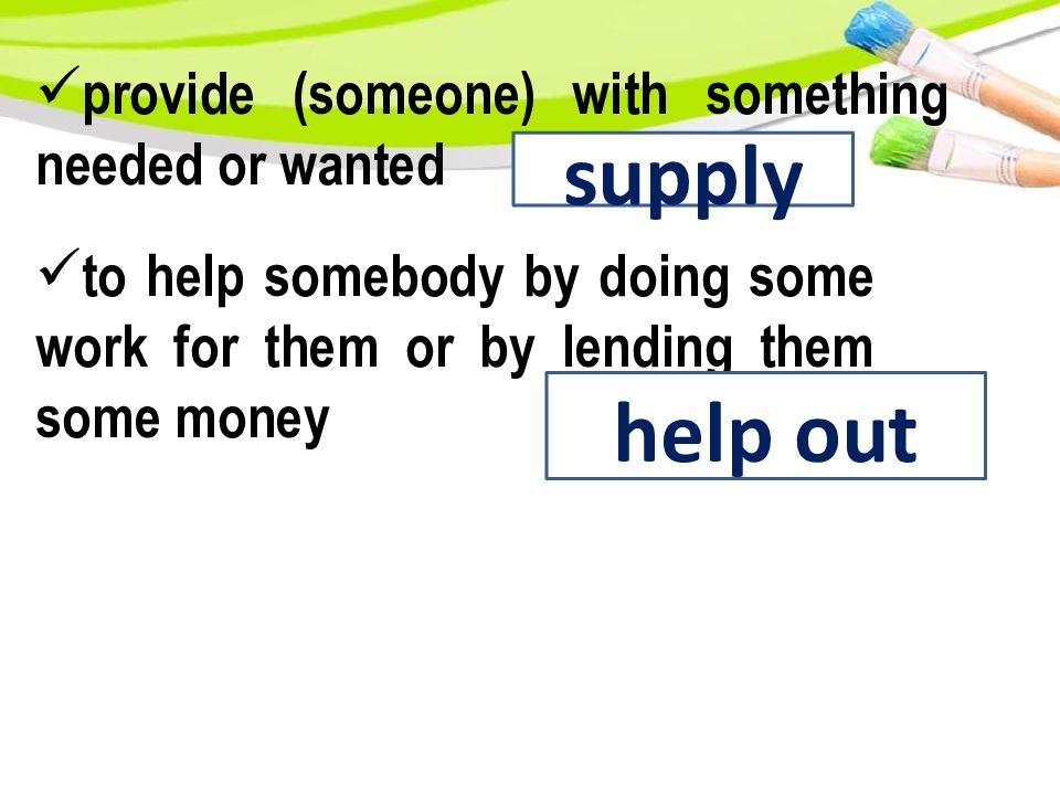 provide (someone) with something needed or wanted supply t o help somebody by doing some work for them or by lending them some money h elp out