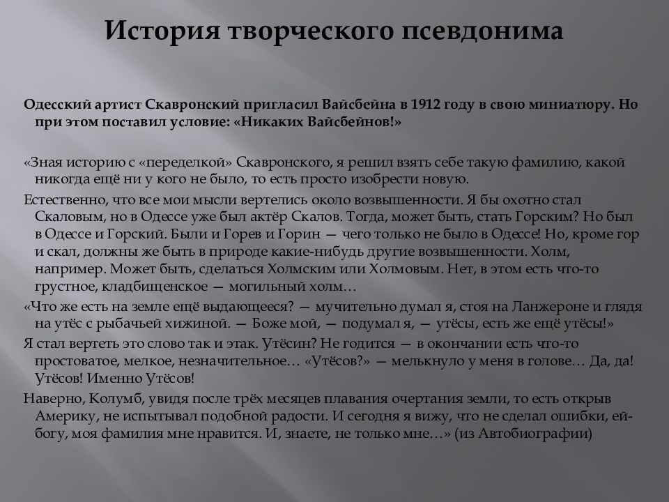 Одесский артист Скавронский пригласил Вайсбейна в 1912 году в свою миниатюру. Но при этом поставил условие: «Никаких Вайсбейнов !» «Зная историю с «переделкой» Скавронского, я решил взять себе такую фамилию, какой никогда ещё ни у кого не было, то есть просто изобрести новую. Естественно, что все мои мысли вертелись около возвышенности. Я бы охотно стал Скаловым, но в Одессе уже был актёр Скалов. Тогда, может быть, стать Горским? Но был в Одессе и Горский. Были и Горев и Горин — чего только не было в Одессе! Но, кроме гор и скал, должны же быть в природе какие-нибудь другие возвышенности. Холм, например. Может быть, сделаться Холмским или Холмовым. Нет, в этом есть что-то грустное, кладбищенское — могильный холм… «Что же есть на земле ещё выдающееся? — мучительно думал я, стоя на Ланжероне и глядя на утёс с рыбачьей хижиной. — Боже мой, — подумал я, — утёсы, есть же ещё утёсы!» Я стал вертеть это слово так и этак. Утёсин ? Не годится — в окончании есть что-то простоватое, мелкое, незначительное… «Утёсов?» — мелькнуло у меня в голове… Да, да! Утёсов! Именно Утёсов! Наверно, Колумб, увидя после трёх месяцев плавания очертания земли, то есть открыв Америку, не испытывал подобной радости. И сегодня я вижу, что не сделал ошибки, ей-богу, моя фамилия мне нравится. И, знаете, не только мне…» (из Автобиографии)