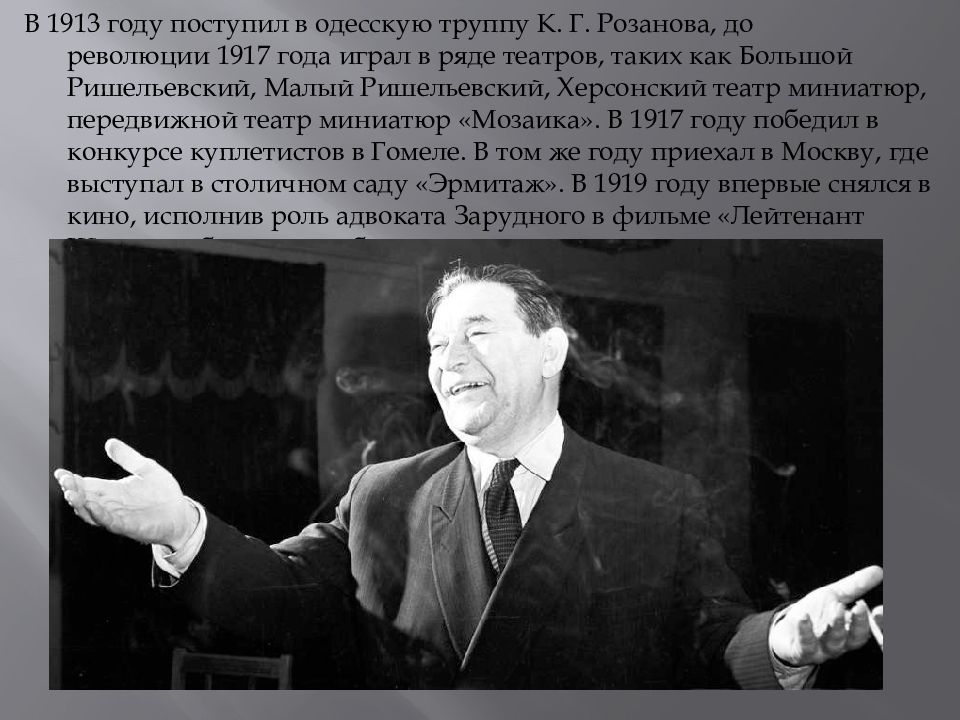 В 1913 году поступил в одесскую труппу К. Г. Розанова, до революции 1917 года играл в ряде театров, таких как Большой Ришельевский, Малый Ришельевский, Херсонский театр миниатюр, передвижной театр миниатюр «Мозаика». В 1917 году победил в конкурсе куплетистов в Гомеле. В том же году приехал в Москву, где выступал в столичном саду «Эрмитаж». В 1919 году впервые снялся в кино, исполнив роль адвоката Зарудного в фильме «Лейтенант Шмидт — борец за свободу».