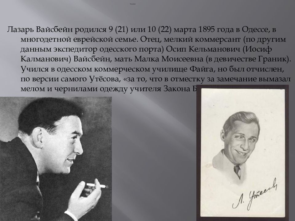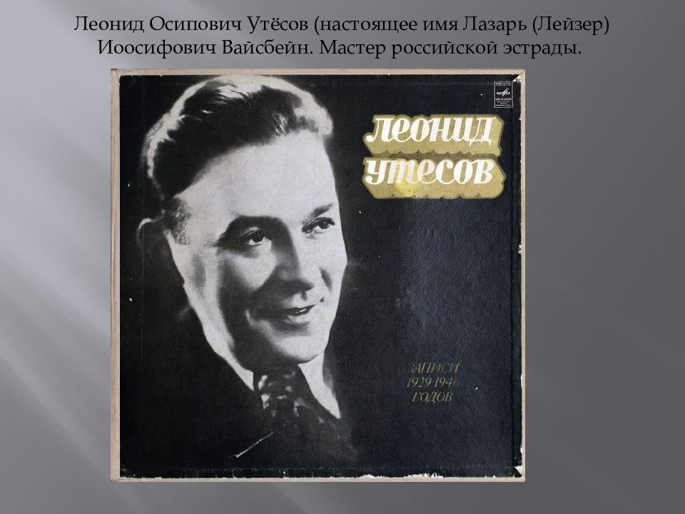 Первый слайд презентации: Леонид Осипович Утёсов (настоящее имя Лазарь (Лейзер) Иоосифович Вайсбейн. Мастер российской эстрады