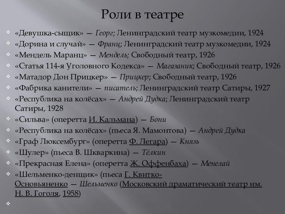 «Девушка-сыщик» — Георг; Ленинградский театр музкомедии, 1924 « Дорина и случай» — Франц ; Ленинградский театр музкомедии, 1924 «Мендель Маранц » — Мендель; Свободный театр, 1926 «Статья 114-я Уголовного Кодекса» — Магазаник ; Свободный театр, 1926 «Матадор Дон Прицкер » — Прицкер ; Свободный театр, 1926 «Фабрика канители» — писатель ; Ленинградский театр Сатиры, 1927 «Республика на колёсах» — Андрей Дудка ; Ленинградский театр Сатиры, 1928 « Сильва » (оперетта И. Кальмана ) — Бони «Республика на колёсах» (пьеса Я. Мамонтова) — Андрей Дудка «Граф Люксембург» (оперетта Ф. Легара ) — Князь «Шулер» (пьеса В. Шкваркина) — Тёлкин «Прекрасная Елена» (оперетта Ж. Оффенбаха ) — Менелай « Шельменко-денщик » (пьеса Г. Квитко-Основьяненко — Шельменко ( Московский драматический театр им. Н. В. Гоголя, 1958 )