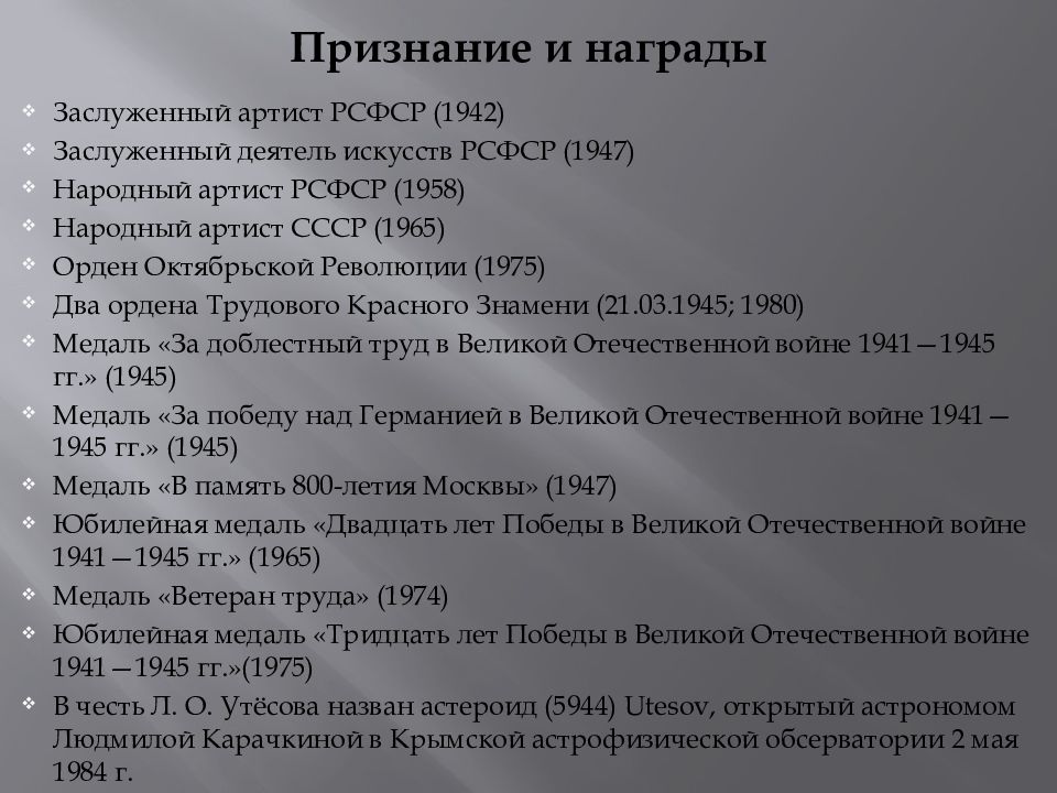 Заслуженный артист РСФСР (1942) Заслуженный деятель искусств РСФСР (1947) Народный артист РСФСР (1958) Народный артист СССР (1965) Орден Октябрьской Революции (1975) Два ордена Трудового Красного Знамени (21.03.1945; 1980) Медаль «За доблестный труд в Великой Отечественной войне 1941—1945 гг.» (1945) Медаль «За победу над Германией в Великой Отечественной войне 1941—1945 гг.» (1945) Медаль «В память 800-летия Москвы» (1947) Юбилейная медаль «Двадцать лет Победы в Великой Отечественной войне 1941—1945 гг.» (1965) Медаль «Ветеран труда» (1974) Юбилейная медаль «Тридцать лет Победы в Великой Отечественной войне 1941—1945 гг.»(1975) В честь Л. О. Утёсова назван астероид (5944) Utesov, открытый астрономом Людмилой Карачкиной в Крымской астрофизической обсерватории 2 мая 1984 г.