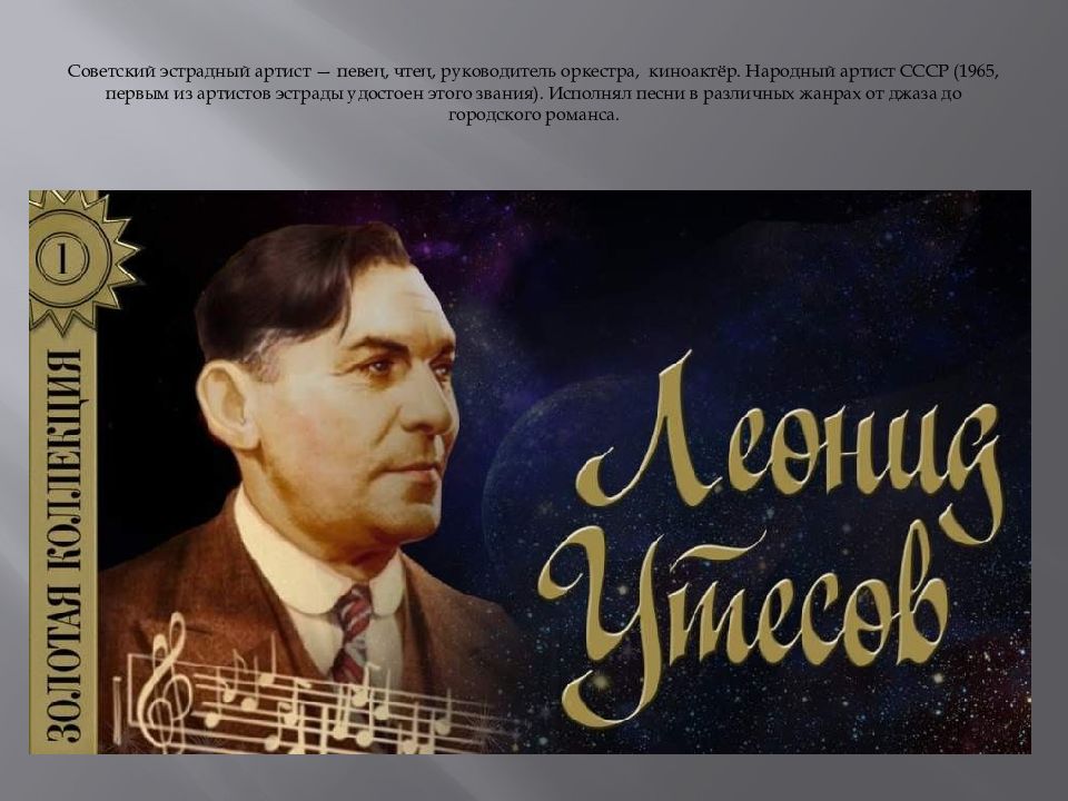 Слайд 2: Советский эстрадный артист — певец, чтец, руководитель оркестра, киноактёр. Народный артист СССР (1965, первым из артистов эстрады удостоен этого звания). Исполнял песни в различных жанрах от джаза до городского романса