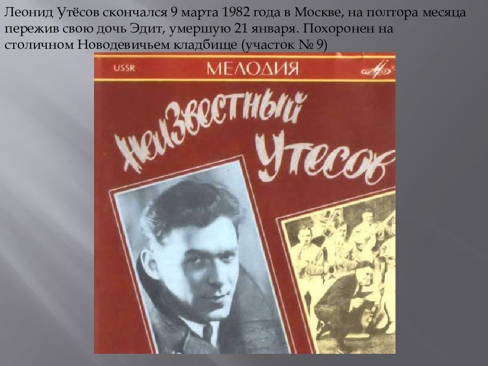 Леонид Утёсов скончался 9 марта 1982 года в Москве, на полтора месяца пережив свою дочь Эдит, умершую 21 января. Похоронен на столичном Новодевичьем кладбище (участок № 9)