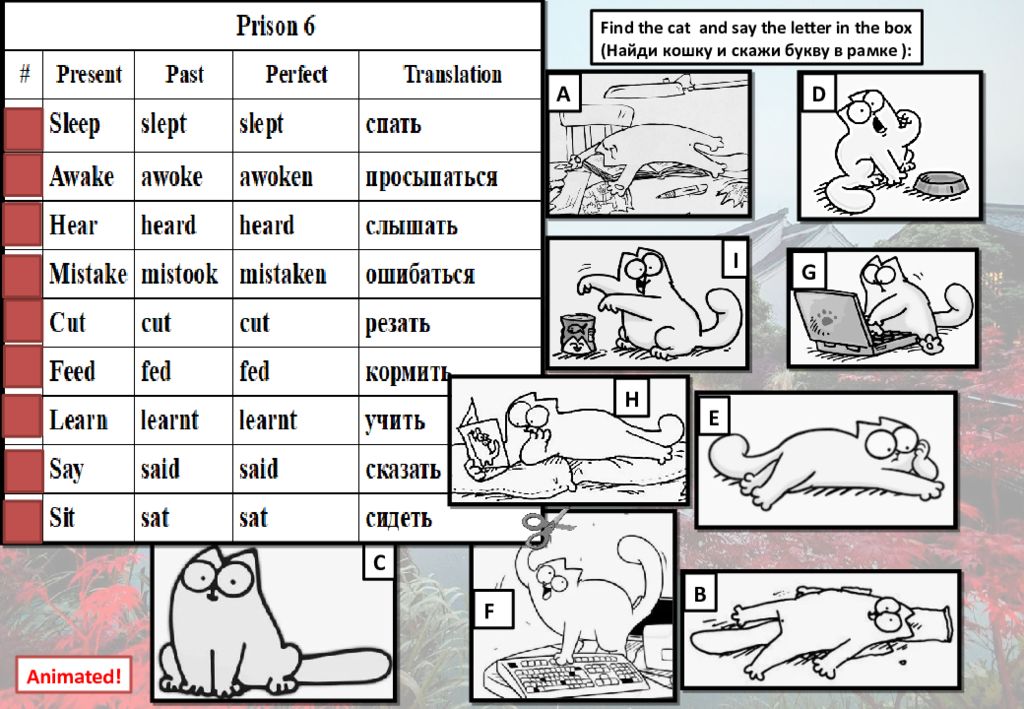 Find the cat and say the letter in the box ( Найди кошку и скажи букву в рамке ) : A B C D E F G I H A B C G F I H D C Animated!