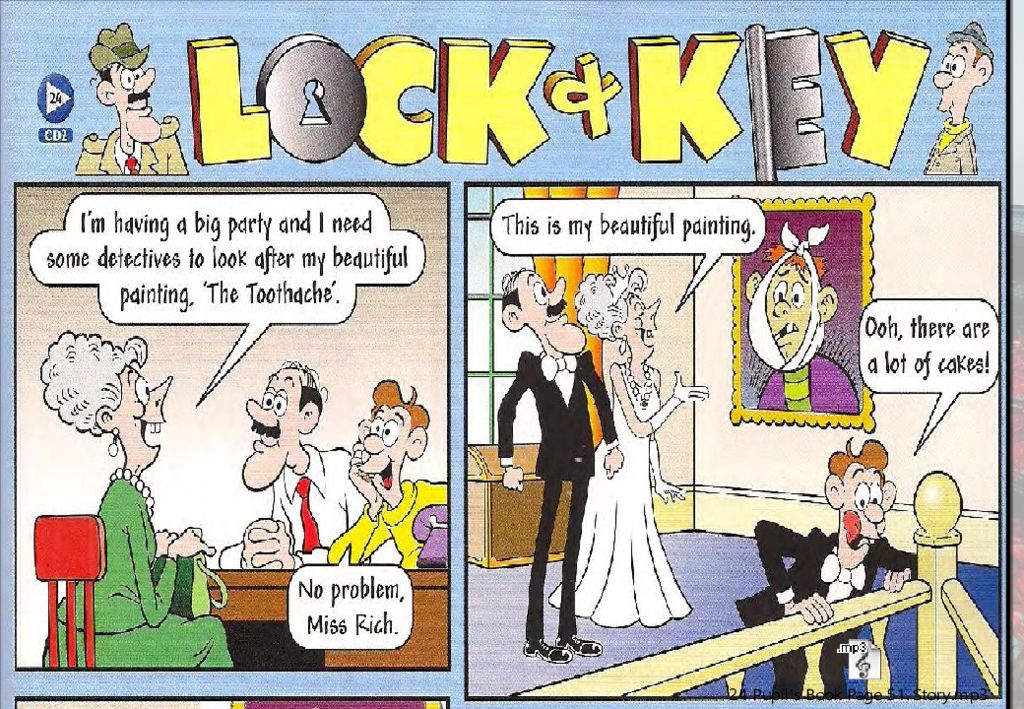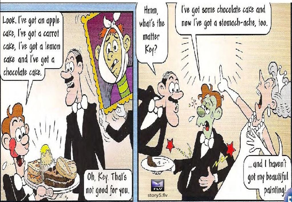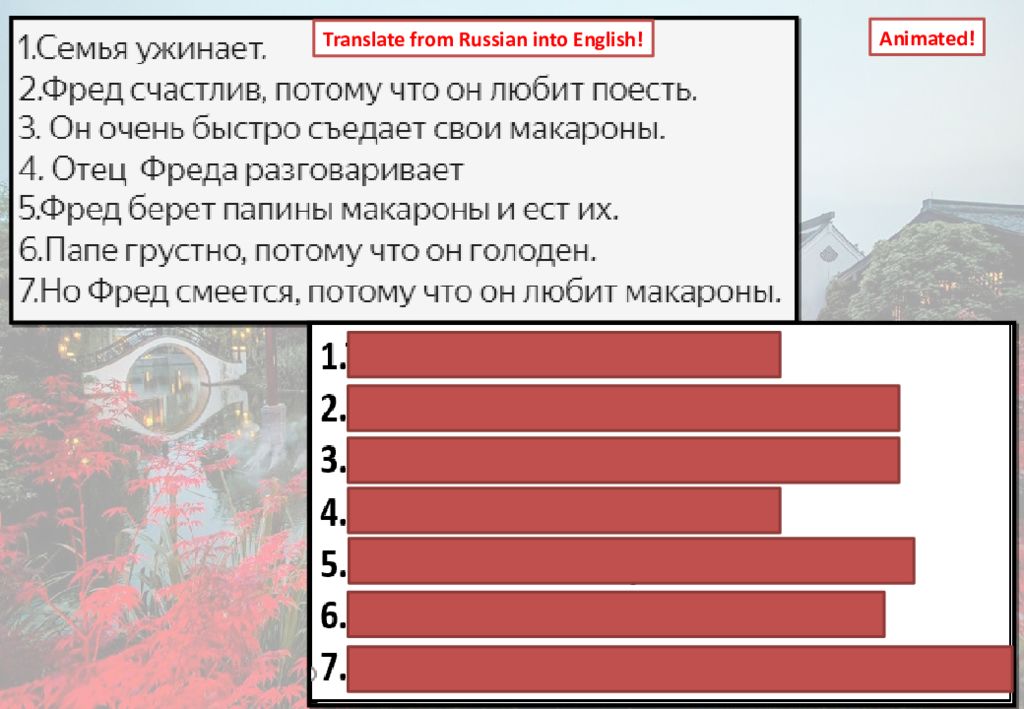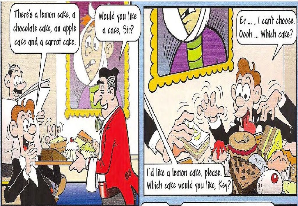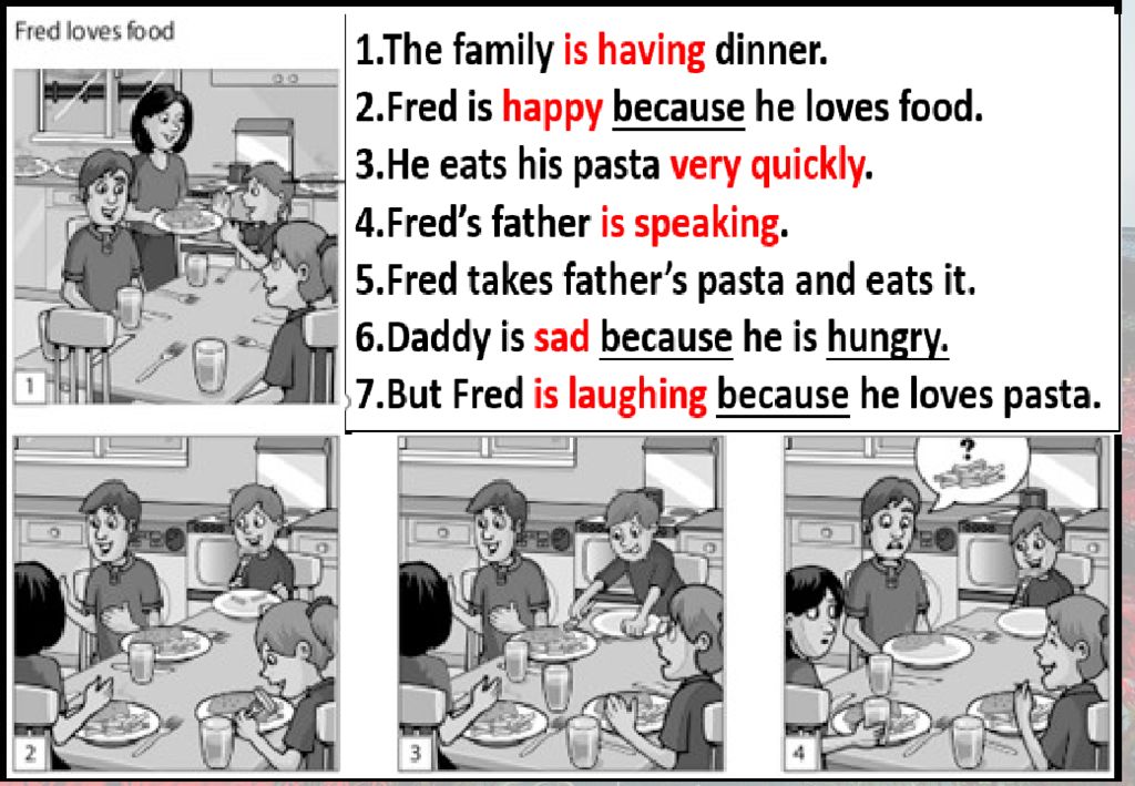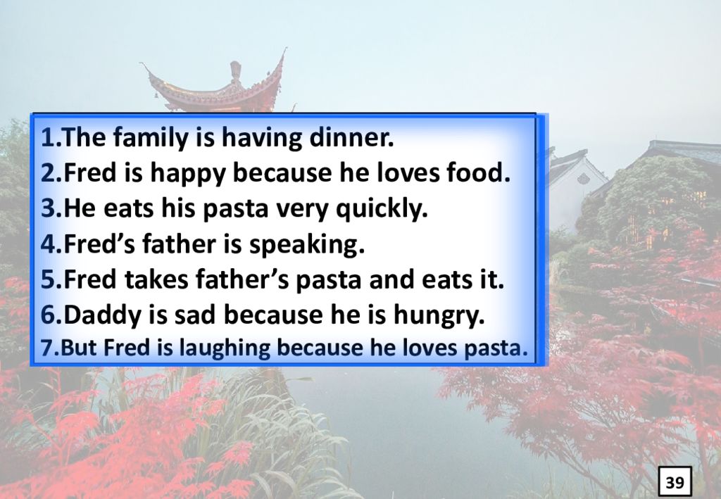 1.The family is having dinner. 2.Fred is happy because he loves food. 3.He eats his pasta very quickly. 4.Fred’s father is speaking. 5.Fred takes father’s pasta and eats it. 6.Daddy is sad because he is hungry. 7.But Fred is laughing because he loves pasta. 39