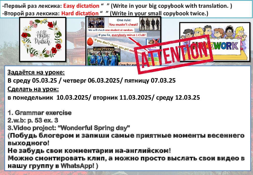 - Первый раз лексика : Easy dictation “ ” (Write in your big copybook with translation. ) -Второй раз лексика : Hard dictation “ ” (Write in your small copybook twice. ) Задаётся на уроке : В среду 05.0 3.25 / четверг 06.0 3.2025/ пятницу 07.0 3.25 Сделать на урок: в понедельник 10. 03.202 5 / вторник 11. 03.202 5 / среду 12. 03.2 5 1. Grammar exercise 2.w.b: p. 53 ex. 3 3.Video project: “Wonderful Spring day” (Побудь блогером и запиши самые приятные моменты весеннего выходного! Не забудь свои комментарии на-английском! Можно смонтировать клип, а можно просто выслать свои видео в нашу группу в WhatsApp ! )