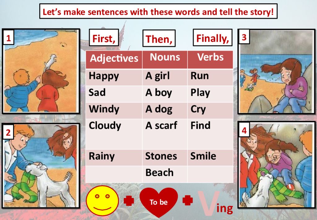 Let’s make sentences with these words and tell the story! First, Then, Finally, Adjectives Nouns Verbs Happy A girl Run Sad A boy Play Windy A dog Cry Cloudy A scarf Find Rainy Stones Smile Beach 1 2 3 4 To be V ing