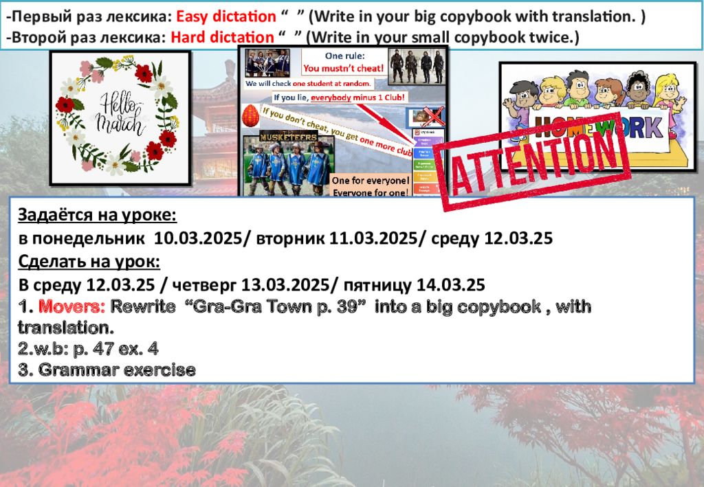 - Первый раз лексика : Easy dictation “ ” (Write in your big copybook with translation. ) -Второй раз лексика : Hard dictation “ ” (Write in your small copybook twice. ) Задаётся на уроке : в понедельник 10. 03.202 5 / вторник 11. 03.202 5 / среду 12. 03.2 5 Сделать на урок: В среду 12. 03.2 5 / четверг 13. 03.202 5 / пятницу 14. 03.2 5 1. Movers: Rewrite “ Gra-Gra Town p. 39” into a big copybook, with translation. 2.w.b: p. 47 ex. 4 3. Grammar exercise