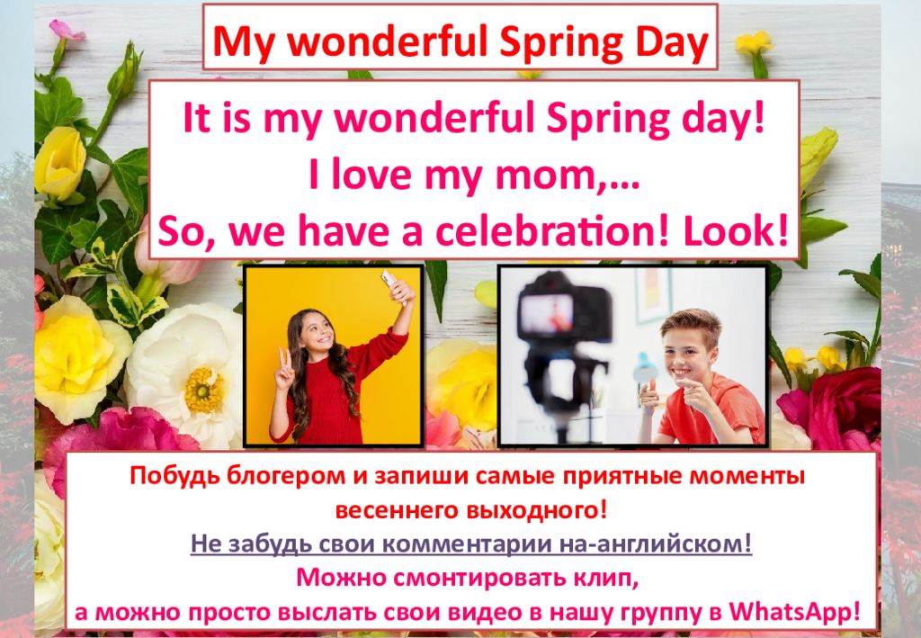 My wonderful Spring Day It is my wonderful Spring day! I love my mom,… So, we have a celebration! Look! Побудь блогером и запиши самые приятные моменты весеннего выходного! Не забудь свои комментарии на-английском! Можно смонтировать клип, а можно просто выслать свои видео в нашу группу в WhatsApp!