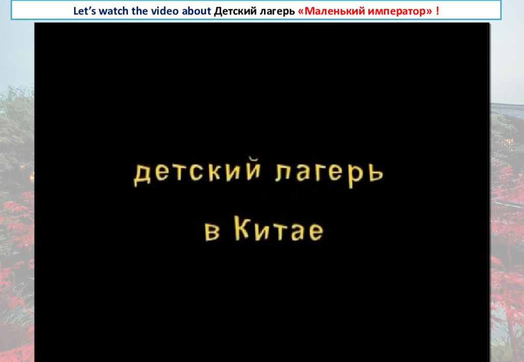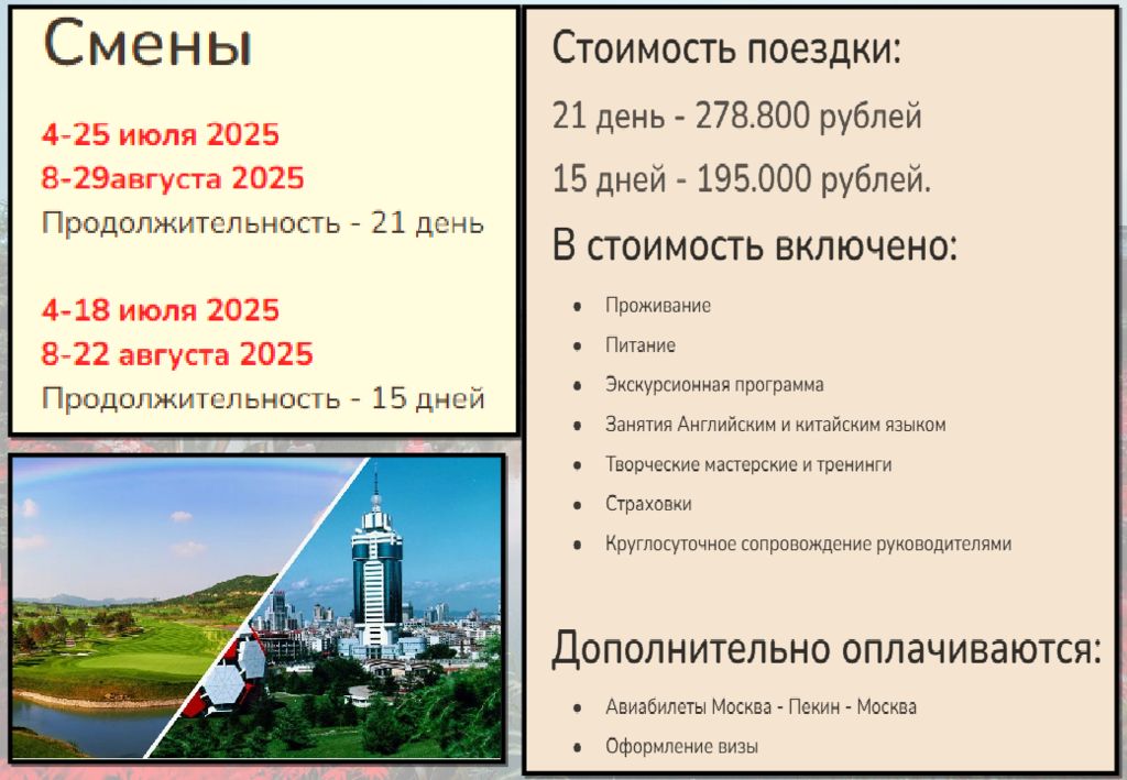 Помимо изучения языка, в Китае детей ждет множество развлечений : - Осмотр памятников культуры - Экскурсии в музеи - Посещение парков аттракционов и аквапарка - Удивительные театральные представления - Работа с фото и видеокамерой - Спортивные занятия - Мастер - классы и тренинги - Встречи с китайскими школьниками На протяжении всей смены в лагере дети снимают собственный кинофильм, а профессиональный оператор обучает ребят искусству работы с видеокамерой, построению композиции кадра, написанию сценариев. В конце смены каждый ребенок получает готовый фильм о своем отдыхе в лагере.