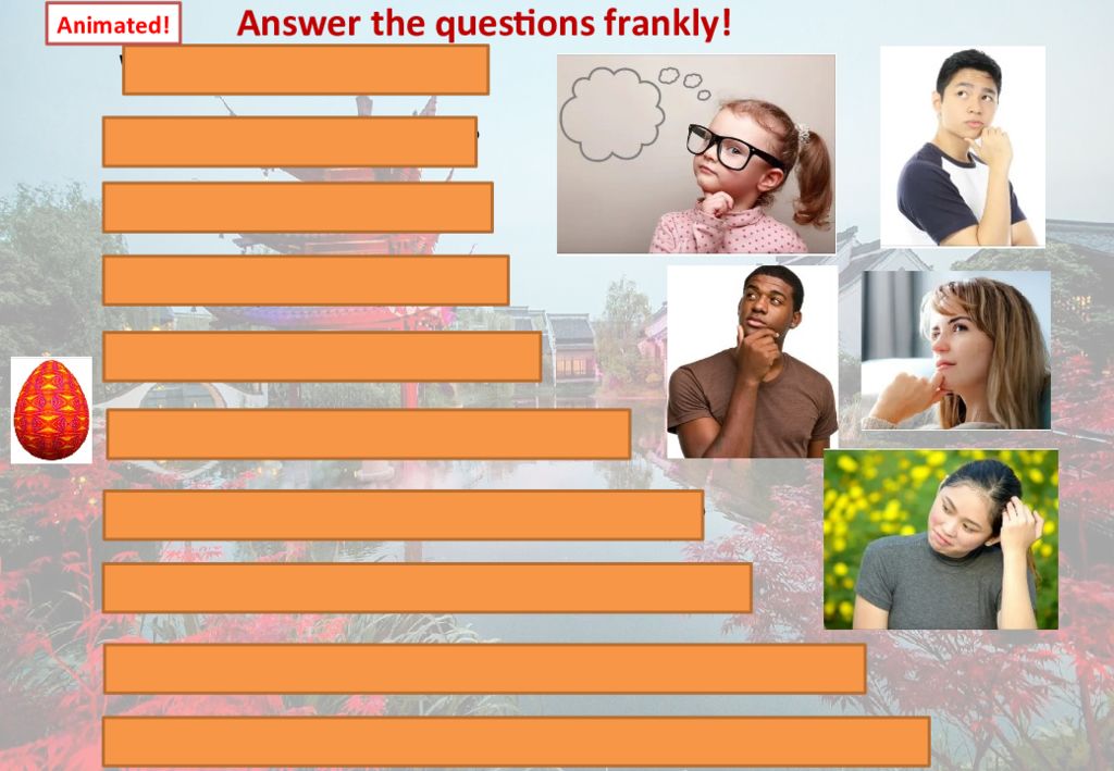 Answer the questions frankly! Who did you help today? Who helped you yesterday? Who is scary for you? When are you happy? Why do you help your family? Why does your family take care of you? What is the best way to spend your holidays? Does the telephone help you study? How? What marks in school do you want to correct next term? Do you think you are lazy? Why? Animated!