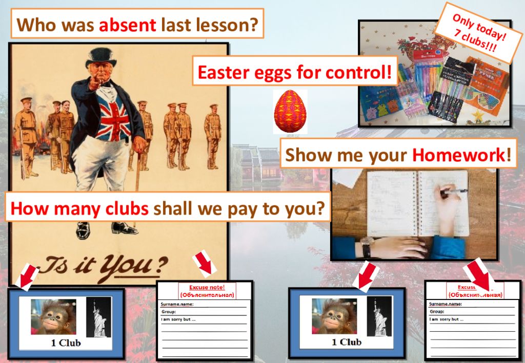 Who was absent last lesson? Only today! 7 clubs!!! Show me your Homework ! How many clubs shall we pay to you? Easter eggs for control!
