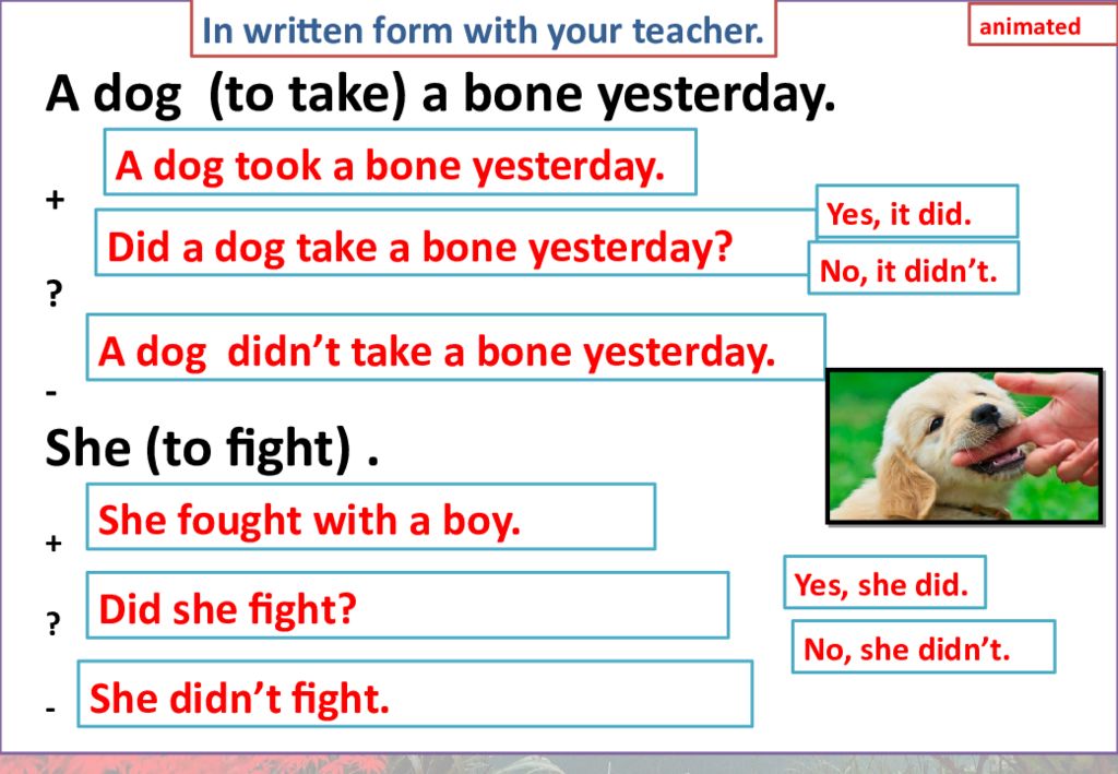 A dog (to take) a bone yesterday. + ? - She (to fight). + ? - A dog took a bone yesterday. Did a dog take a bone yesterday? Yes, it did. No, it didn’t. A dog didn’t take a bone yesterday. She fought with a boy. Did she fight? Yes, she did. No, she didn’t. She didn’t fight. animated In written form with your teacher.