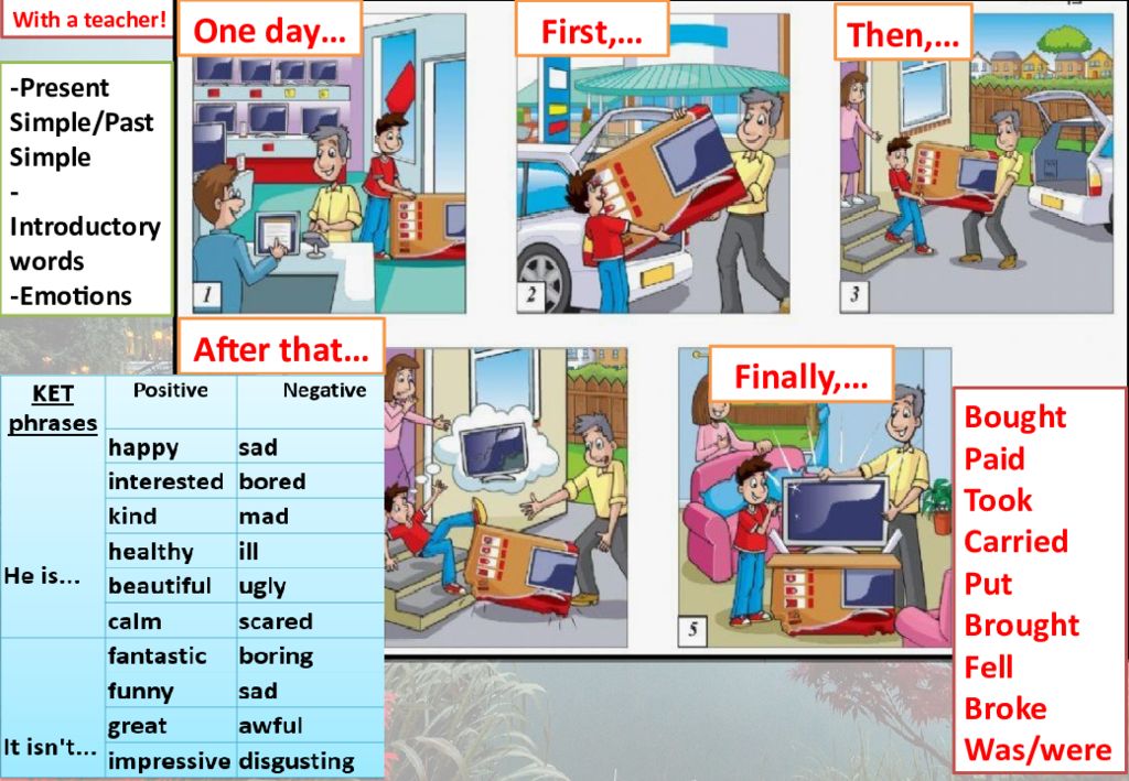 With a teacher! Bought Paid Took Carried Put Brought Fell Broke Was/were One day… First,… Then,… After that… Finally,… -Present Simple/Past Simple -Introductory words -Emotions