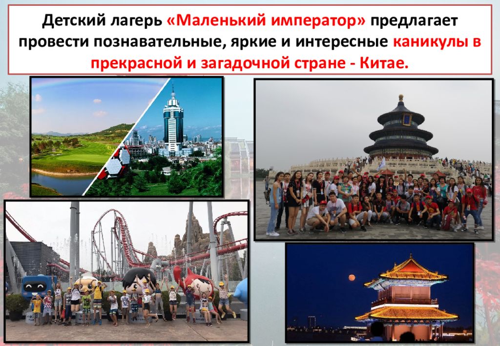 Детский лагерь «Маленький император» предлагает провести познавательные, яркие и интересные каникулы в прекрасной и загадочной стране - Китае.