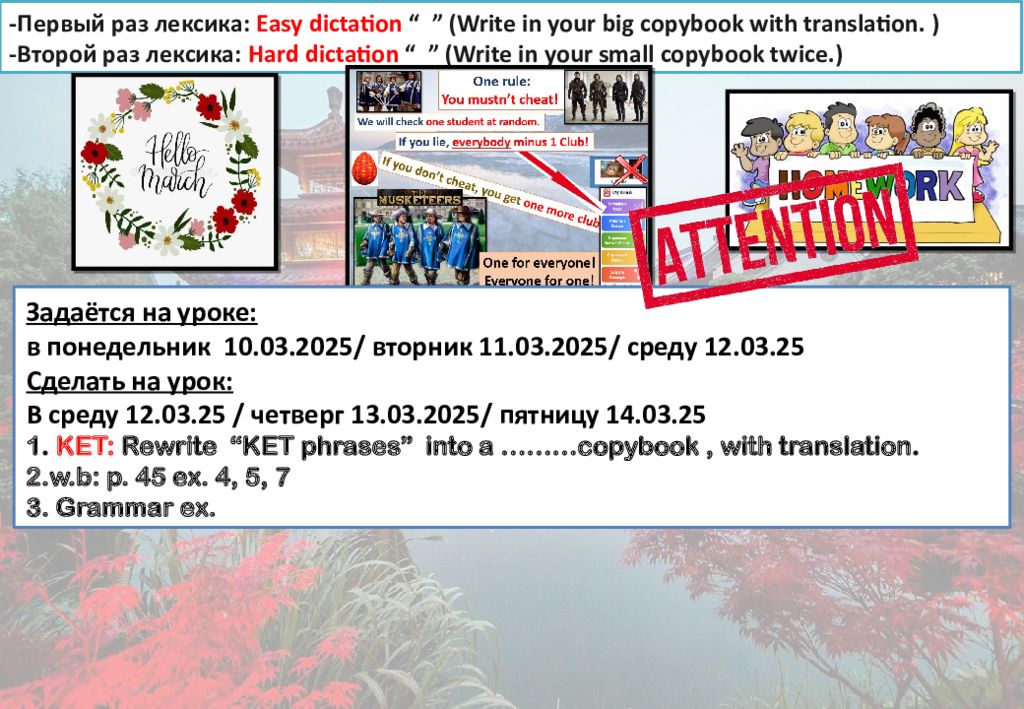 - Первый раз лексика : Easy dictation “ ” (Write in your big copybook with translation. ) -Второй раз лексика : Hard dictation “ ” (Write in your small copybook twice. ) Задаётся на уроке : в понедельник 10. 03.202 5 / вторник 11. 03.202 5 / среду 12. 03.2 5 Сделать на урок: В среду 12. 03.2 5 / четверг 13. 03.202 5 / пятницу 14. 03.2 5 1. KET : Rewrite “KET phrases” into a ………copybook, with translation. 2.w.b : p. 45 ex. 4, 5, 7 3. Grammar ex.
