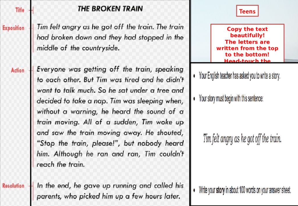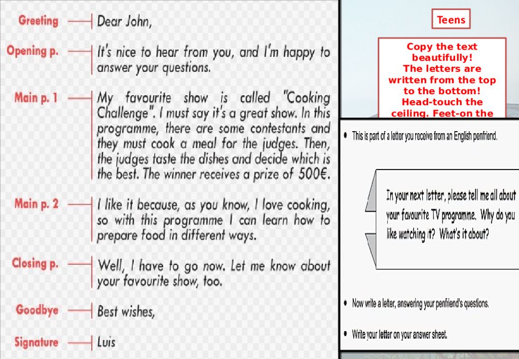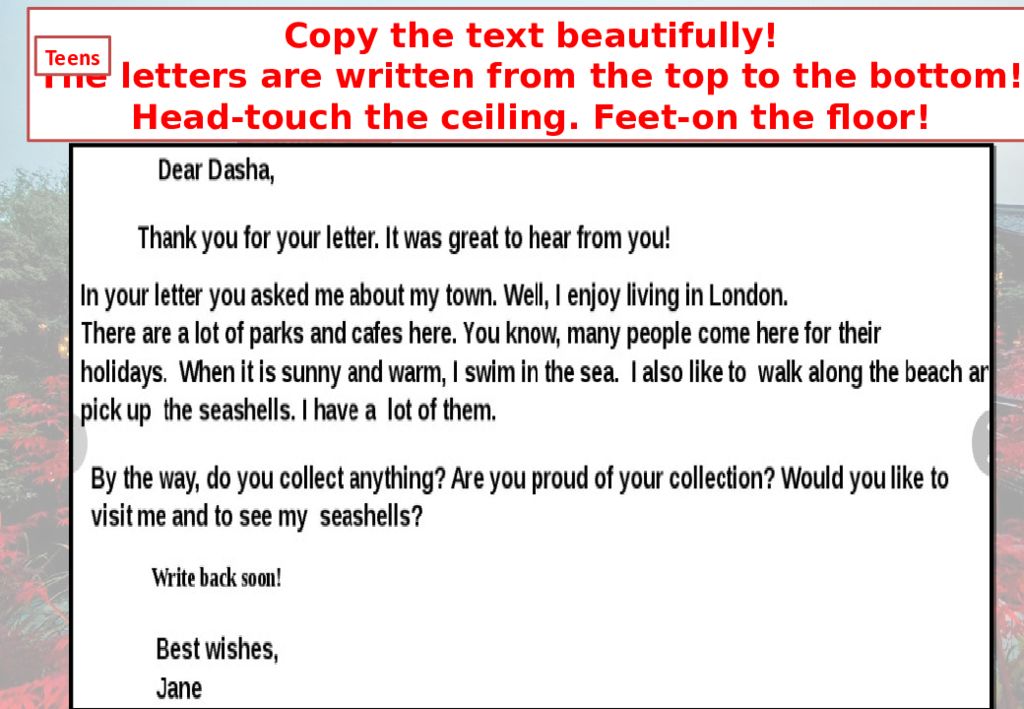 Copy the text beautifully! The letters are written from the top to the bottom! Head-touch the ceiling. Feet-on the floor! Teens