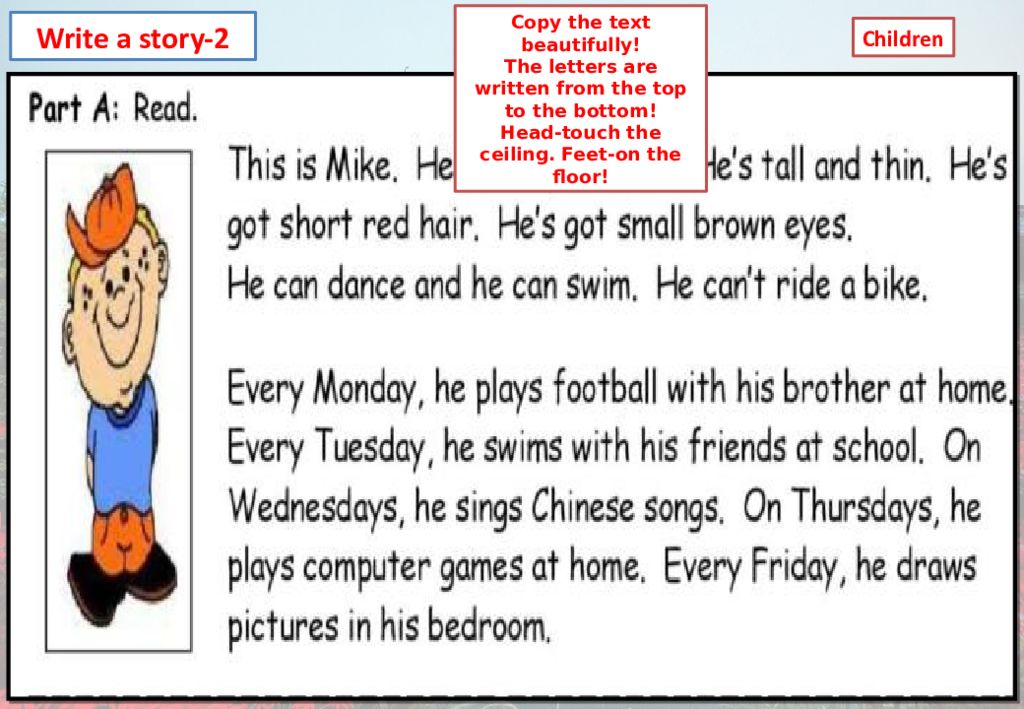 Write a story-2 Copy the text beautifully! The letters are written from the top to the bottom! Head-touch the ceiling. Feet-on the floor! Children