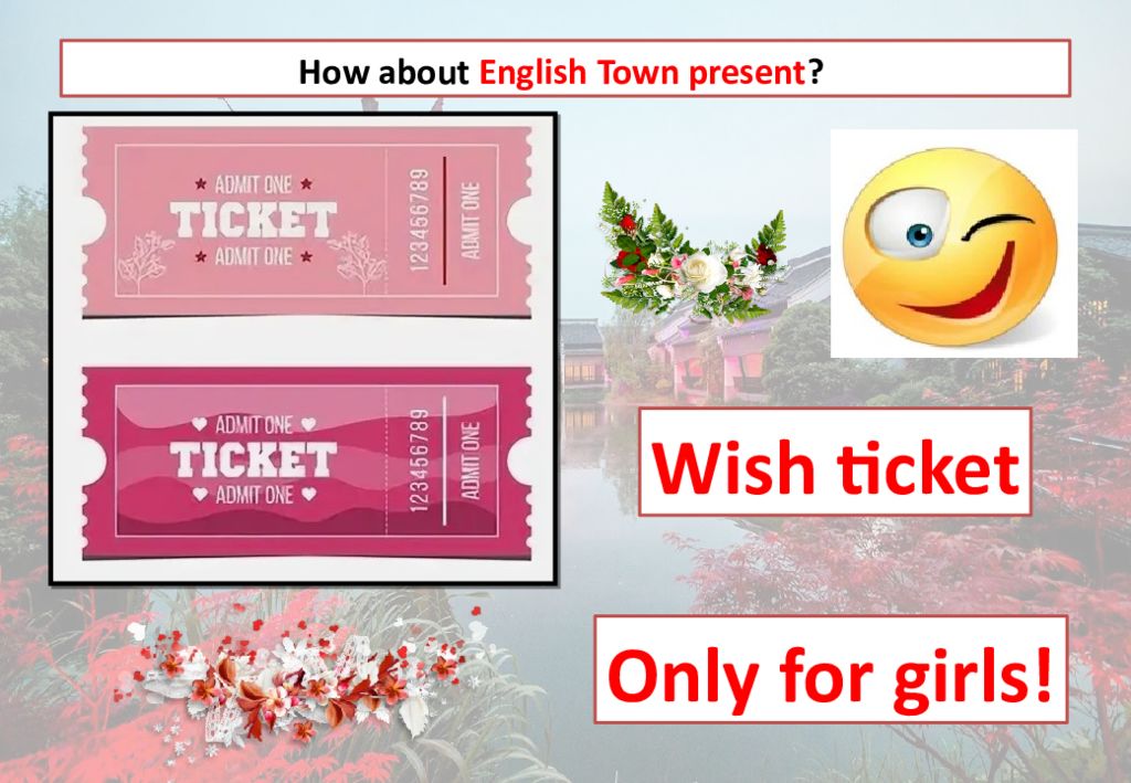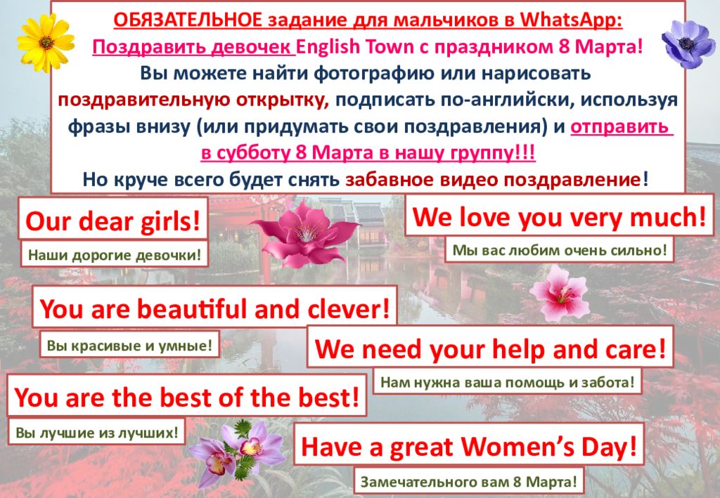 Our dear girls! You are beautiful and clever! We need your help and care! We love you very much! You are the best of the best! Have a great Women’s Day! ОБЯЗАТЕЛЬНОЕ задание для мальчиков в WhatsApp : Поздравить девочек English Town с праздником 8 Марта! Вы можете найти фотографию или нарисовать поздравительную открытку, подписать по-английски, используя фразы внизу (или придумать свои поздравления) и отправить в субботу 8 Марта в нашу группу!!! Но круче всего будет снять забавное видео поздравление ! Наши дорогие девочки ! Мы вас любим очень сильно ! Вы красивые и умные ! Нам нужна ваша помощь и забота ! Вы лучшие из лучших ! Замечательного вам 8 Марта !