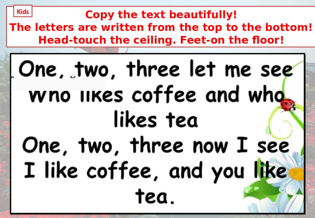 Copy the text beautifully! The letters are written from the top to the bottom! Head-touch the ceiling. Feet-on the floor! Kids
