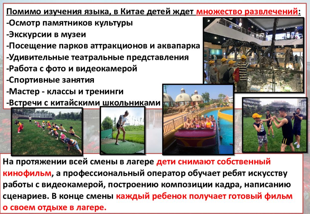 Помимо изучения языка, в Китае детей ждет множество развлечений : - Осмотр памятников культуры - Экскурсии в музеи - Посещение парков аттракционов и аквапарка - Удивительные театральные представления - Работа с фото и видеокамерой - Спортивные занятия - Мастер - классы и тренинги - Встречи с китайскими школьниками На протяжении всей смены в лагере дети снимают собственный кинофильм, а профессиональный оператор обучает ребят искусству работы с видеокамерой, построению композиции кадра, написанию сценариев. В конце смены каждый ребенок получает готовый фильм о своем отдыхе в лагере.